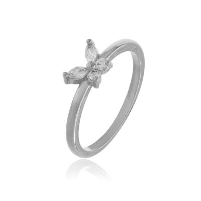 Anel em formato de borboleta com 4 zircônias cristal. • Material: Peça feita com liga metálica e disponível nos banhos de ródio branco e de ouro amarelo 18k. Banho antialérgico e sem níquel na composição. Pedra: Zircônia • Design e Medidas: 2 zircônias redondas de 1mm de diâmetro e 1 zircônias em losango com 3mm de comprimento.