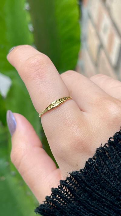 Anel delicado escrito familia em baixo relevo com banho antialérgico de ouro 18k.