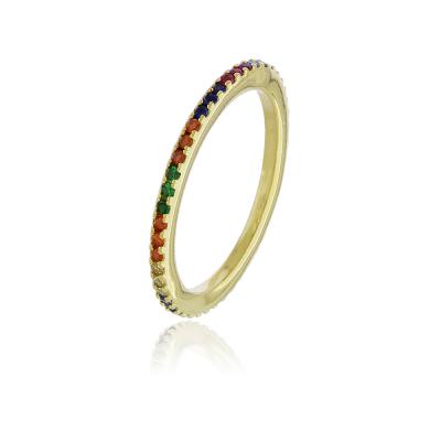 Anel com pedrinhas de zircônia coloridas cravejados na volta inteira do anel. • Material: Peça feita com liga metálica e disponível nos banhos de ródio branco e de ouro amarelo 18k. Banho antialérgico e sem níquel na composição. • Design e Medidas: Largura do anel: 1mm. Anel com zircônias coloridas na volta inteira (pink, verde, citrino, laranja e azul).