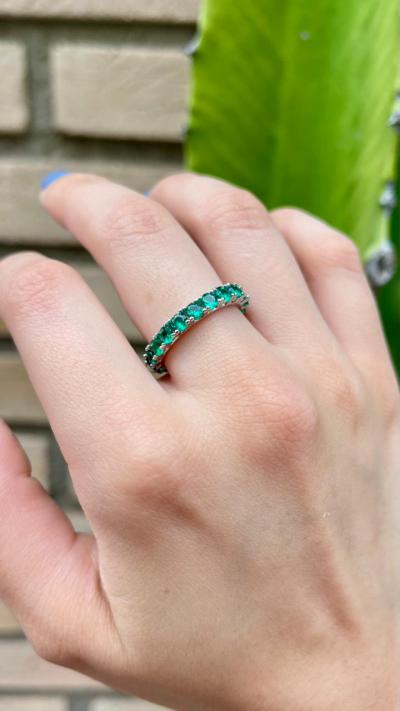 Anel Hailey com volta inteira de pedrinhas de zircônia verde esmeralda com banho de metais nobres. Anel com 2mm de diâmetro cada pedrinha. MODELO DOURADO -banho antialérgico de ouro amarelo 18K. MODELO PRATA -banho de ródio branco que é muito superior ao banho de prata.