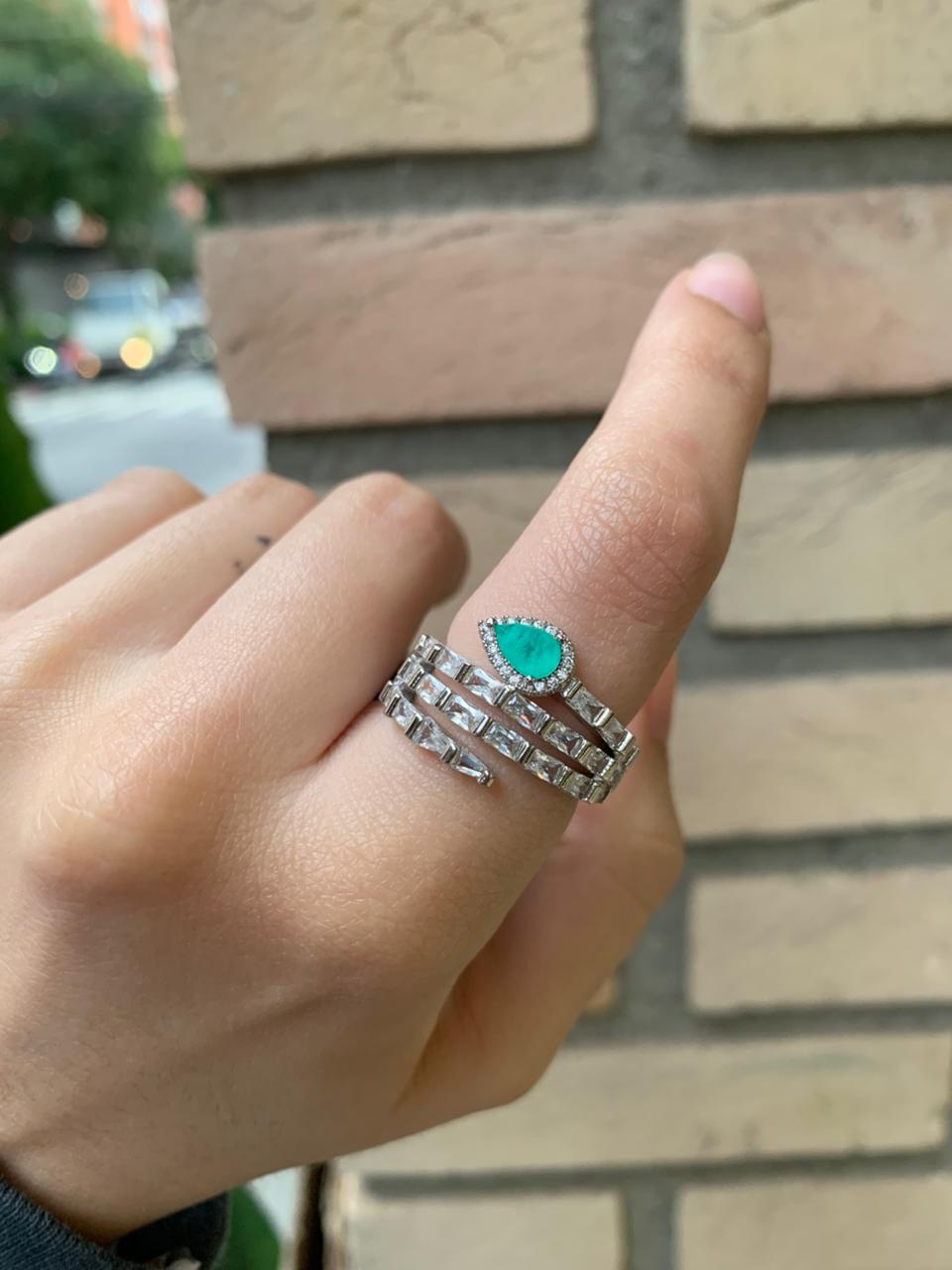 Anel Voltas com pedras cristal e ponta com pedra em formato de gota turmalina e banho de ródio branco.
