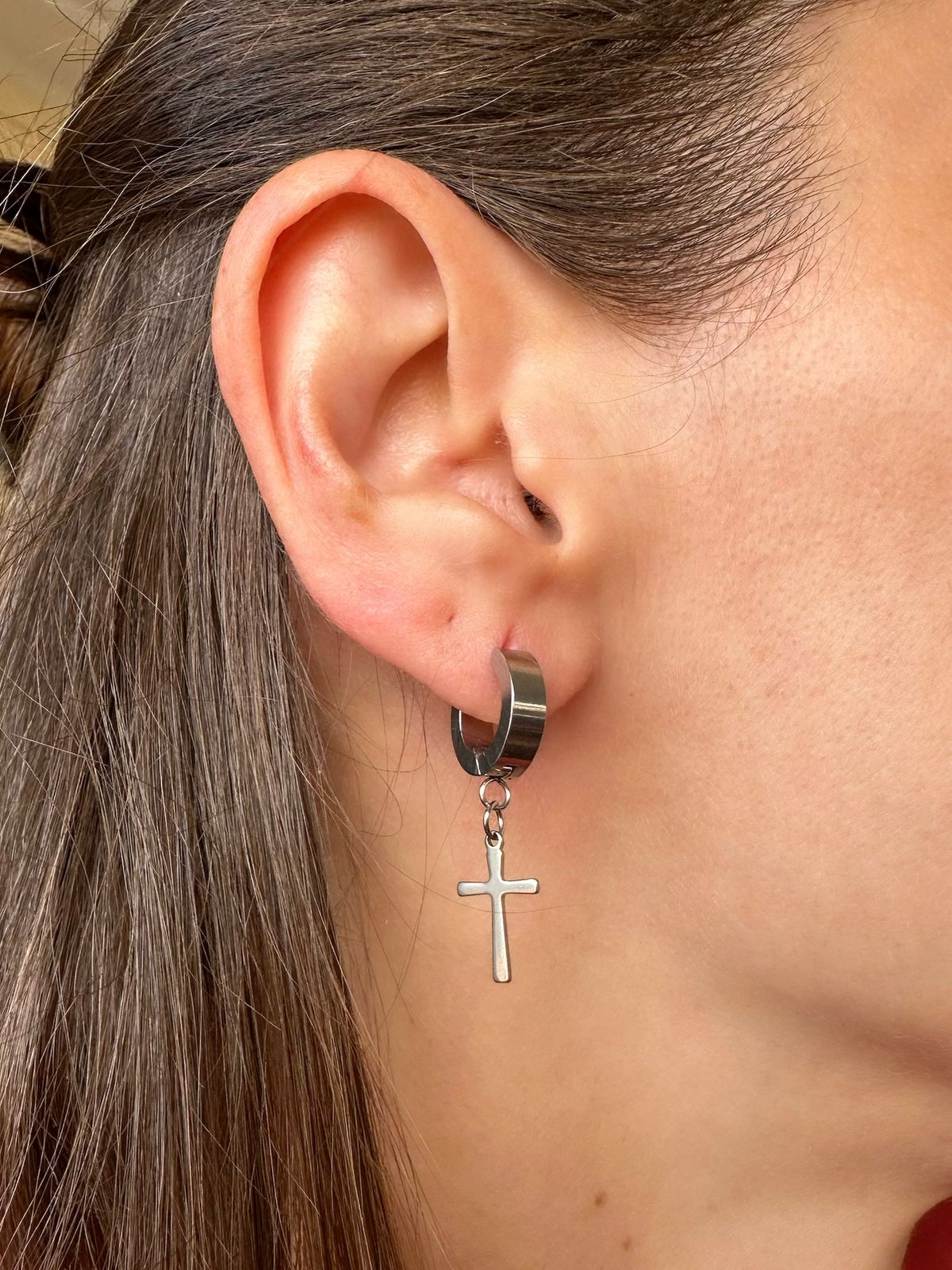 Argolinha Cruz feita em aço inox e não escurece. Argola de click com 5mm de largura e 1,0cm de diâmetro e a cruz com 2,0cm de altura.