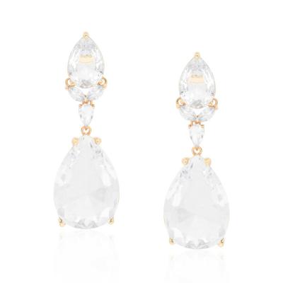 Brinco com duas pedras em formato de gota e 3 pedras menores entre elas formando uma flor na cor cristal com banho de metais nobres. Brinco mede 5,5cm de altura por 2,0cm de largura. MODELO DOURADO -banho antialérgico de ouro amarelo 18K. MODELO PRATA -banho de ródio branco que é muito superior ao banho de prata.