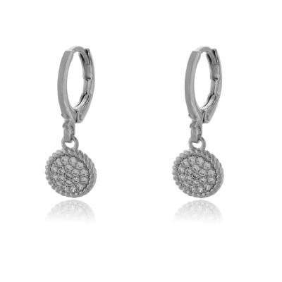 Brinco Argola com pingente de circulo todo cravejado de zircônias brancas e banho de metais nobres. Argola tipo abre fecha com 1,0cm de diâmetro e pingente de 7mm de diâmetro com altura total de 2,0cm. MODELO DOURADO -banho antialérgico de ouro amarelo 18K. MODELO PRATA -banho de ródio branco que é muito superior ao banho de prata.