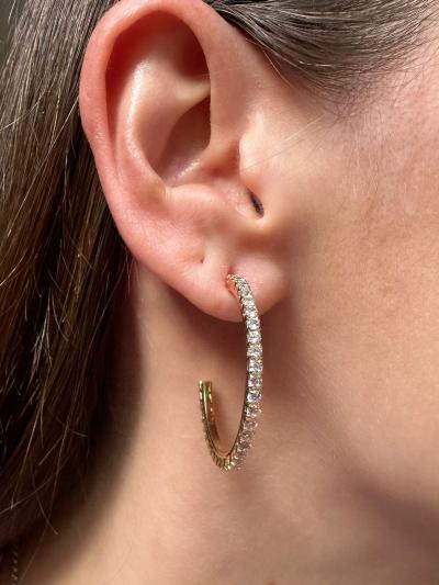Brinco Argola Cravejada na frente inteira com fileira de zircônias e banho de metais nobres. Brinco mede 3,4cm de diâmetro e 2mm de largura. MODELO DOURADO -banho antialérgico de ouro amarelo 18K. MODELO PRATA -banho de ródio branco que é muito superior ao banho de prata.