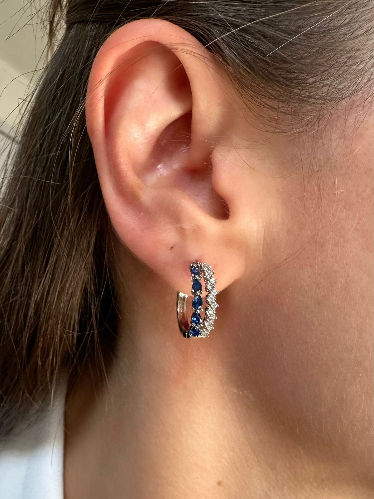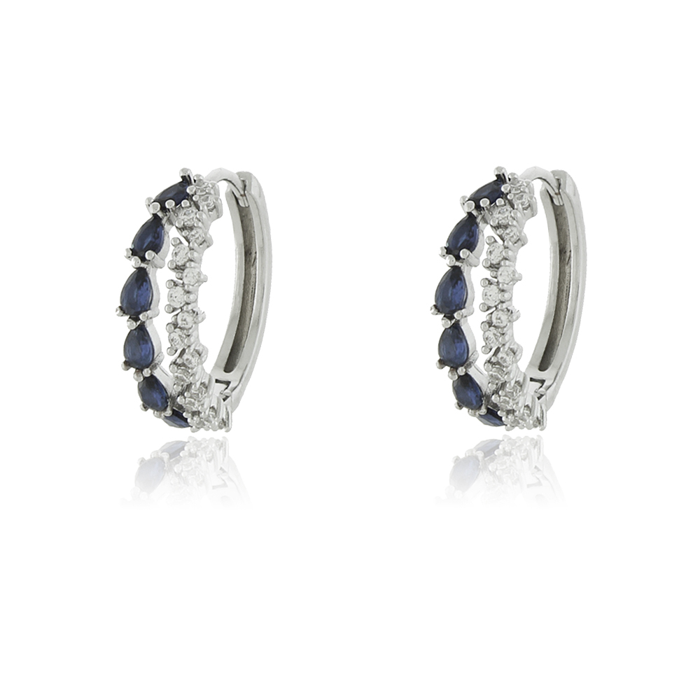Brinco Argola de click com duas faixas (uma de zircônia cristal e outra de zircônia azul safira) separadas com vazado no meio o que dá impressão de duas argolas e banho de ródio branco.