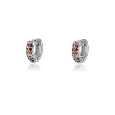 Brinco de argola com pedrinhas de zircônia coloridas cravejados na frente da argola. • Material: Peça feita com liga metálica e disponível nos banhos de ródio branco e de ouro amarelo 18k. Banho antialérgico e sem níquel na composição. • Design e Medidas: Medida de cada argola: 1,0cm de diâmetro Argola de click Cada brinco contém 12 zircônias coloridas (pink, verde, lavanda, laranja e cristal) na frente da argola com 2 fileiras.