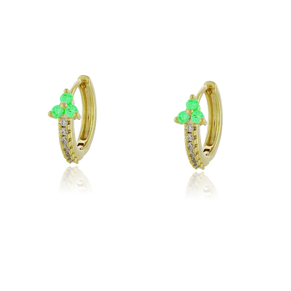 Brinco de argola com 3 pedrinhas de zircônia e cravejado na frente da argola. • Material: Peça feita com liga metálica e disponível nos banhos de ródio branco e de ouro amarelo 18k. Banho antialérgico e sem níquel na composição. • Design e Medidas: Medida de cada argola: 1,3cm de diâmetro Cada brinco contém 3 zircônias em cima na forma de trevo com cor verde e mais 7 zircônias cravejadas cristal na frente da argola.