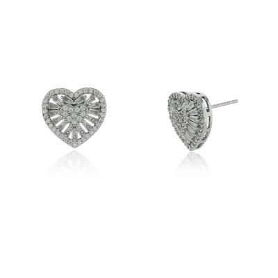 Brinco Baguete Coração com banho de ródio branco. Brinco mede 1,5cm de altura e de largura