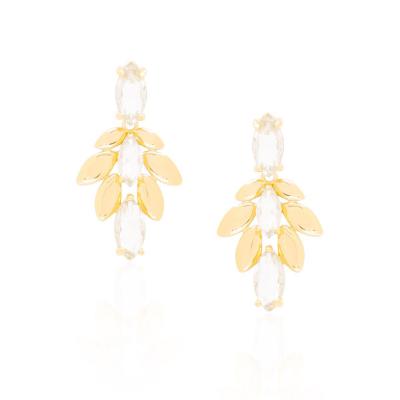 Brinco Festa Folha com 3 pedras cristal em formato de losango no meio e formato de folha em metal liso com banho de metais nobres. Brinco mede 3,2cm de altura por 2,0cm de largura. MODELO DOURADO-banho antialérgico de ouro amarelo 18K. MODELO PRATA -banho de ródio branco que é muito superior ao banho de prata. Produtos relac