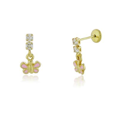 Brinco Infantil Borboleta com dois mini pontos de luz em cima da borboleta de resina rosa com banho antialérgico de ouro amarelo 18K. Brinco mede 1,0cm de altura por 0,4cm de largura.