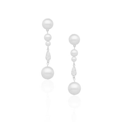 Brinco Longo Perolas com gotinha cravejada no meio e banho de metais nobres. Brinco mede 5,0cm de altura por 1,2cm de largura MODELO DOURADO -banho antialérgico de ouro amarelo 18K. MODELO PRATA -banho de ródio branco que é muito superior ao banho de prata.