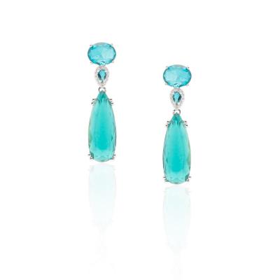 Brinco com 2 pedras sendo uma oval e outra em gota na cor turmalina e no meio entre elas uma mini gota nas cores verde (puxado para o azul petróleo) e no vermelhor rubi com a volta inteira cravejada de zircônias brancas com banho de ródio branco. Brinco mede 4,0cm de altura por 1,0cm de largura.