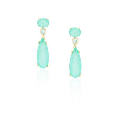 Brinco com 2 pedras sendo uma oval e outra em gota na cor turmalina e no meio entre elas uma mini gota turmalina com a volta inteira cravejada de zircônias brancas com banho de metal nobre. Brinco mede 4,0cm de altura por 1,0cm de largura. MODELO DOURADO -banho antialérgico de ouro amarelo 18K. MODELO PRATA -banho de ródio branco que é muito superior ao banho de prata.