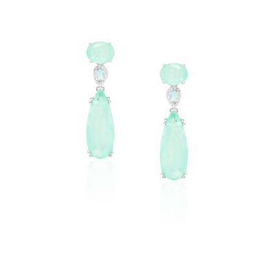 Brinco com 2 pedras sendo uma oval e outra em gota na cor turmalina e no meio entre elas uma mini gota turmalina com a volta inteira cravejada de zircônias brancas com banho de metal nobre. Brinco mede 4,0cm de altura por 1,0cm de largura. MODELO DOURADO -banho antialérgico de ouro amarelo 18K. MODELO PRATA -banho de ródio branco que é muito superior ao banho de prata.
