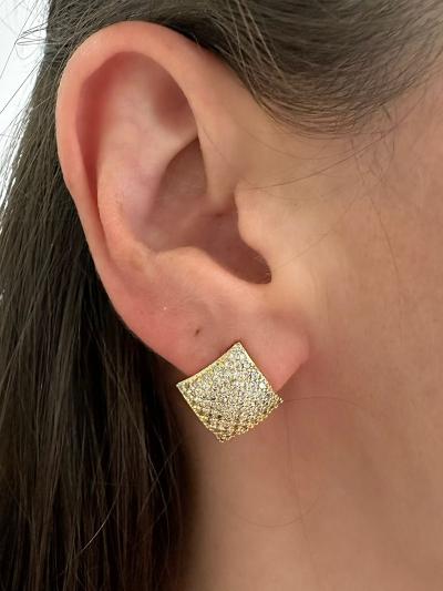 Brinco Quadrado Cravejado com 1,2cm de cada lado cheio de zircônias brancas e banho de ouro amareo e de ródio branco.