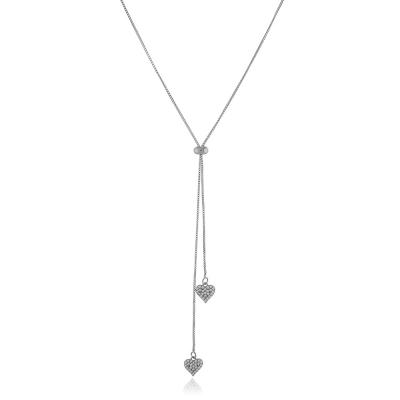 Colar estilo "gravatinha" com 2 corações cravejados de zircônias na ponta. • Material: Peça feita com liga metálica e disponível nos banhos de ródio branco e de ouro amarelo 18k. Banho antialérgico e sem níquel na composição. • Design e Medidas: Corrente: veneziana 0,8. Medida: 65cm de comprimento sem fecho e extensor (regulagem pelo fecho "boia" da frente e regula altura). Corações cravejados da ponta com 0,7cm de altura e largura.