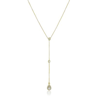 Colar estilo "gravatinha" com 2 pontos de luz na corrente e pingente com pedra me formato de gota cristal e cravejado na volta de zircônias. • Material: Peça feita com liga metálica e disponível nos banhos de ródio branco e de ouro amarelo 18k. Banho antialérgico e sem níquel na composição. • Design e Medidas: Corrente: veneziana 0,6. Medida: 51cm de comprimento mais 3,5cm de extensor e 7,0cm de faixa caída do colar. Zircônia na corrente de 2mm cada. Fecho lagostinha. Pingente em formato de gota: 0,7cm de altura por 0,6cm de largura.
