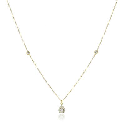 Colar com 2 pontos de luz na corrente e pingente com pedra me formato de gota cristal e cravejado na volta de zircônias. • Material: Peça feita com liga metálica e disponível nos banhos de ródio branco e de ouro amarelo 18k. Banho antialérgico e sem níquel na composição. • Design e Medidas: Corrente: elo português bem fino e delicado. Medida: 41,50cm de comprimento mais 5cm de extensor. Zircônia na corrente de 2mm cada. Fecho lagostinha. Pingente em formato de gota: 0,7cm de altura por 0,6cm de largura.