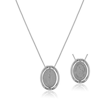 Colar com pingente de Nossa Senhora de Fatima de um lado e vira para o outro lado com imagem de duas mão juntas em posição de oração escrito em volta: "Nossa Senhora de Fátima, rogai por nós" com banho de metais nobres. Corrente tipo veneziana medindo 45cm de comprimento mais 5cm de extensor e pingente mede 2,2cm de altura por 1,7cm de largura. MODELO DOURADO -banho antialérgico de ouro amarelo 18K. MODELO PRATA -banho de ródio branco que é muito superior ao banho de prata.