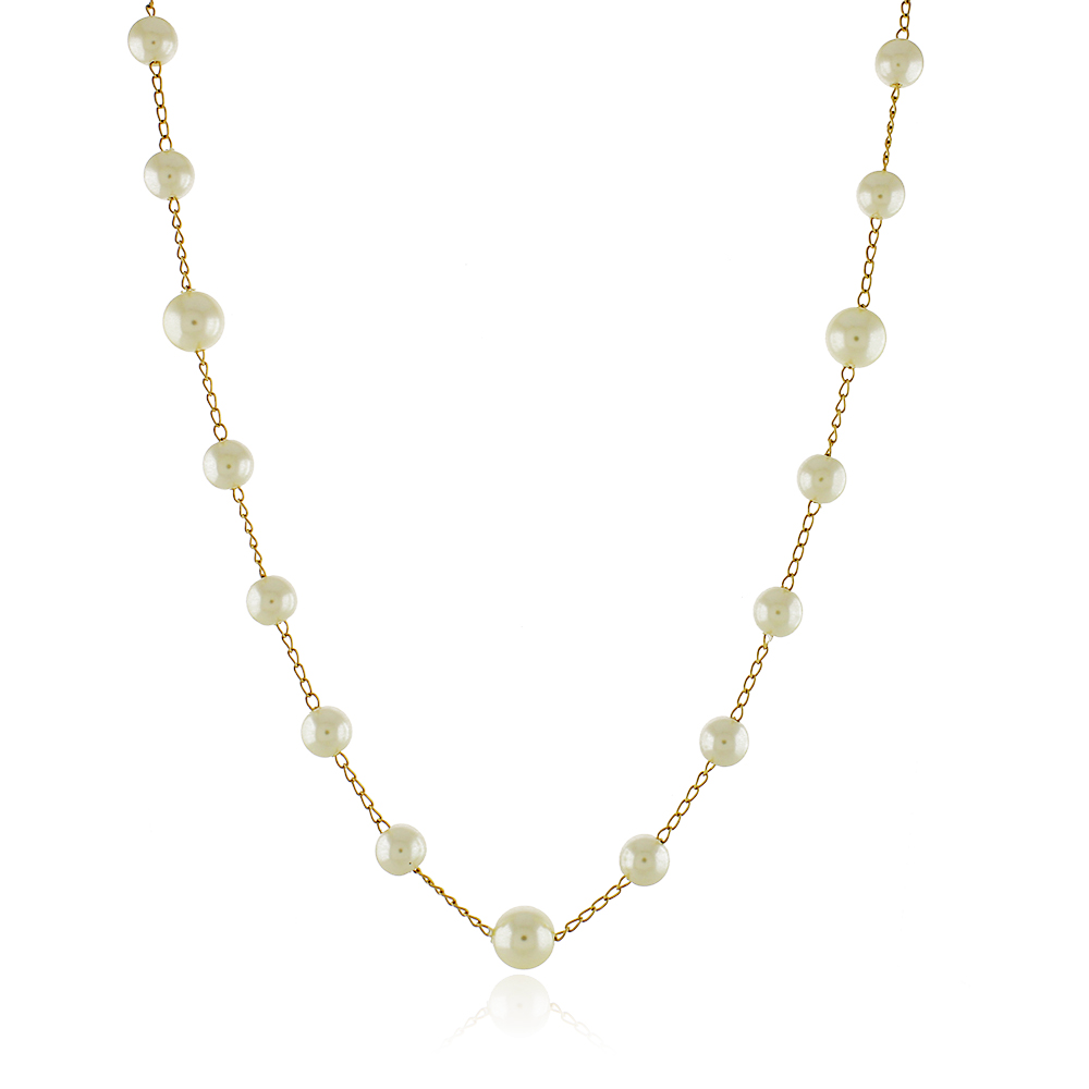Colar Pérolas Espaçadas com 15 pérolas sendo 3 pérolas maiores de 10mm e 12 pérolas menores de 6mm com banho antialérgico de ouro amarelo 18k. Colar mede 39cm mais 10cm de extensor.