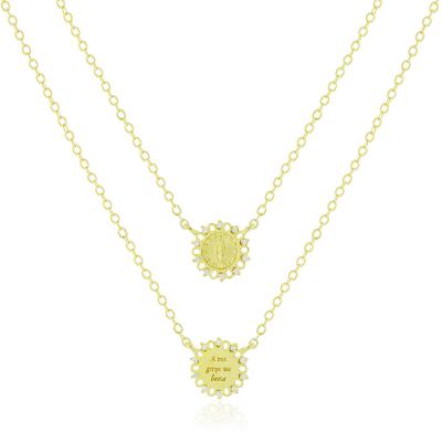Escapulário com pingentes fixos em formato redondo com imagem de Nossa Senhora das Graças de um lado e mensagem "A tua graça me basta" de outro com algumas zircônias cravejadas na volta e banho de metais nobres. Corrente tipo elo português com 60cm de comprimento (sem fecho) e cada pingente com 1,1cm de diâmetro. MODELO DOURADO -banho antialérgico de ouro amarelo 18K. MODELO PRATA -banho de ródio branco que é muito superior ao banho de prata.