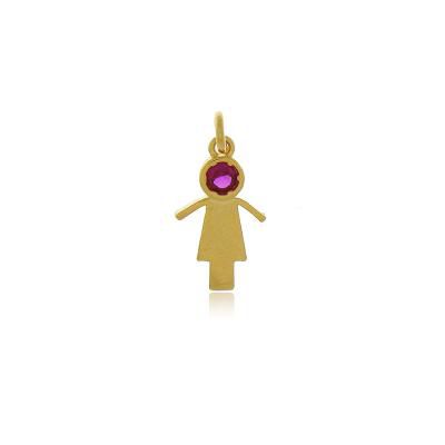 Pingente Menina com uma pedra cristal vermelho rubi na cabeça e corpinho liso com banho de metais nobres. Pingente mede 1,5cm de altura por 0,9cm de largura. MODELO DOURADO -banho antialérgico de ouro amarelo 18K. MODELO PRATA -banho de ródio branco que é muito superior ao banho de prata.
