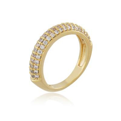 Anel tipo aparador com 3 fileiras de zircônias cravejadas na parte da frente com banho de metais nobres.