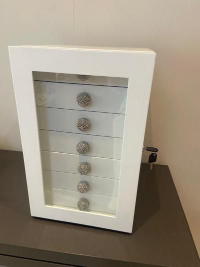 Gaveteiro De 7 Gavetas Compacta (sem rodinha) com chave para trancar as 7 gavetas, com puxador de strass (a foto é do puxador de strass mas não representa o modelo que necessariamente tem na loja a pronta entrega - verificar disponibilidade) Medidas: Altura: 42cm / Largura: 26cm / Profundidade: 29cm Móvel feito em MDF laqueado com toda parte interna forrada de veludo ou suede (na cor bege e tons de bege) e divisórias internas modulávels e padrão de fábrica (podemos também fazer com divisórias sob medida, consultar atrasvés do whatsapp: 11-94475-2477. Essa peça ultrapassa o peso máximo de envio que os Correios entregam, por esse motivo, as vendas devem ser finalizadas pelo nosso whatsapp de vendas para que possamos cotar o frete por transportadora