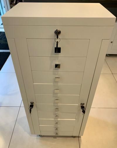 Móvel 10 Gavetas Retangular com 4 rodinhas e chave para trancar o tampo de cima e as portas laterais (a foto é do puxador quadradinho liso mas não representa o modelo que necessariamente tem na loja a pronta entrega - verificar disponibilidade) Medidas: Altura: 95cm / Largura: 41cm / Profundidade: 26cm Móvel feito em MDF laqueado com toda parte interna forrada de veludo ou suede (na cor bege e tons de bege) e divisórias internas modulávels e padrão de fábrica (podemos também fazer com divisórias sob medida, consultar através do whatsapp: 11-94475-2477. Essa peça ultrapassa o peso máximo de envio que os Correios entregam, por esse motivo, as vendas devem ser finalizadas pelo nosso whatsapp de vendas para que possamos cotar o frete por transportadora.