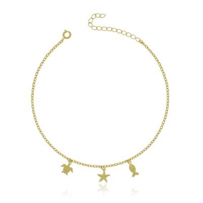 Tornozeleira Fundo Do Mar com 3 pingentes (tartaruga, estrela do mar e peixe) com banho de metais nobres. Corrente de elo português medindo 24cm com mais 5cm de extensor. MODELO DOURADO -banho antialérgico de ouro amarelo 18K. MODELO PRATA -banho de ródio branco que é muito superior ao banho de prata.