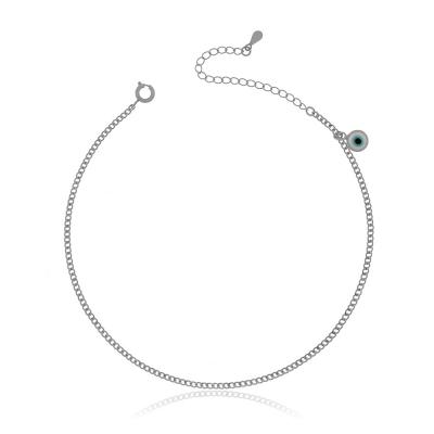 Tornozeleira com pingente de olho grego e banho de metais nobres. Corrente tipo elinhos grumet medindo 24cm com mais 5,5cm de extensor. MODELO DOURADO -banho antialérgico de ouro amarelo 18K. MODELO PRATA -banho de ródio branco que é muito superior ao banho de prata.